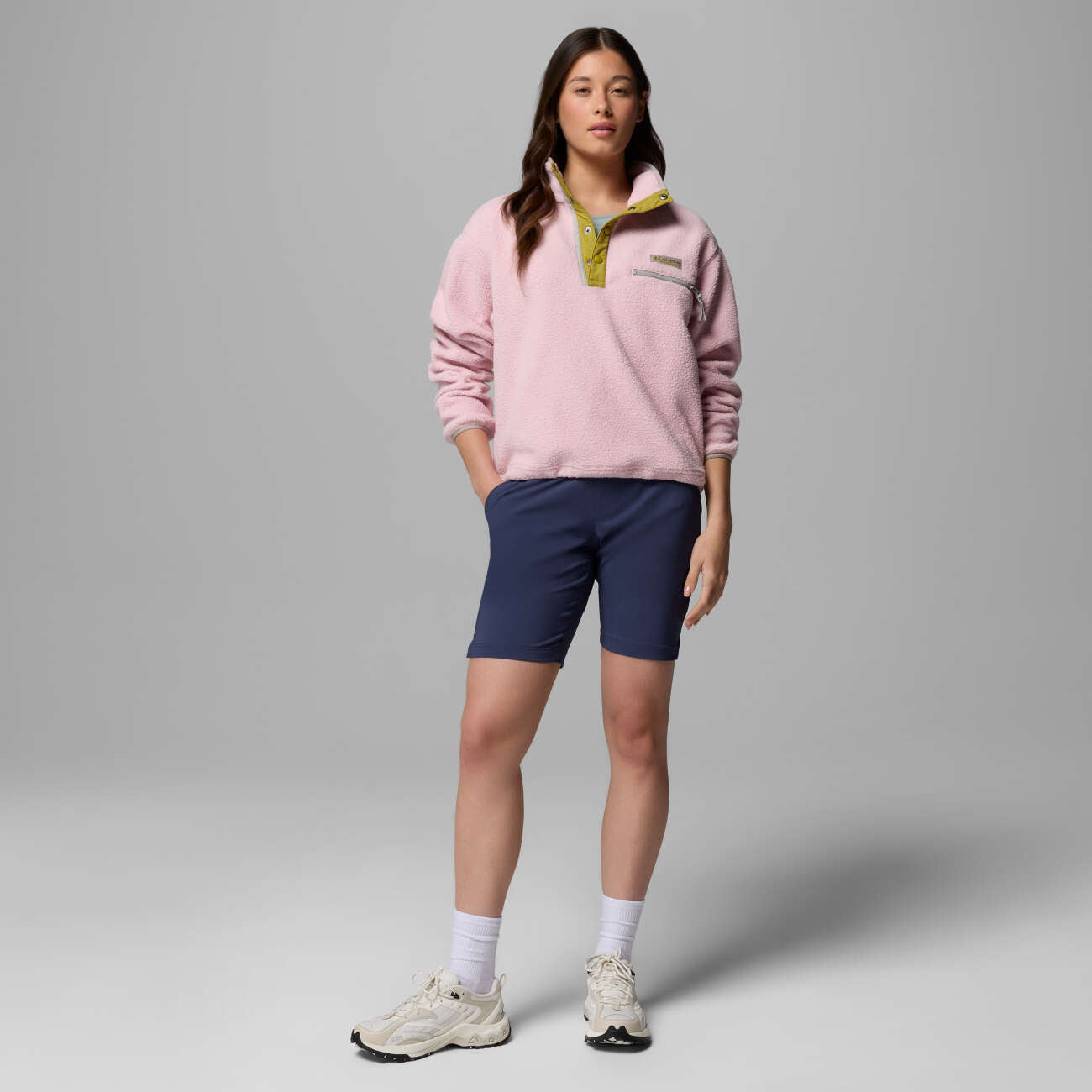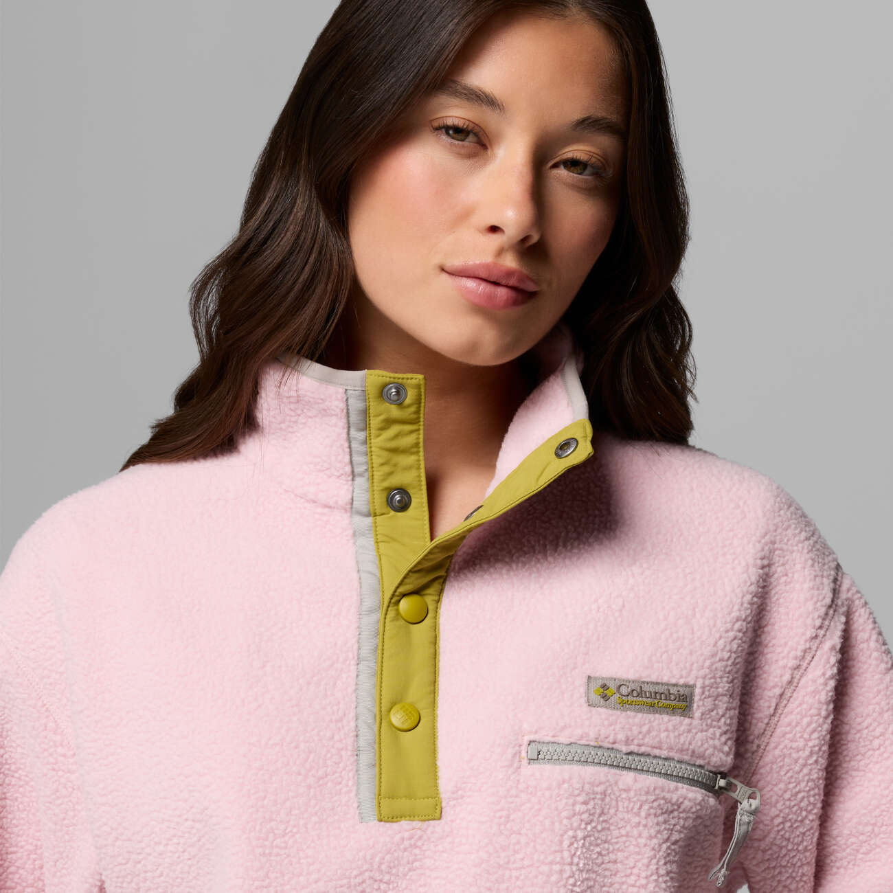 Das Columbia Helvetia™ II Cropped Half Snap Fleece in pink agate-peppercorn-flint grey überzeugt mit trendiger Cropped-Passform und funktionaler Wärmeleistung. Das weiche Polyester sorgt für Komfort, während der Half-Snap-Kragen einen sportlichen Outdoor-Look verleiht. 2092231694